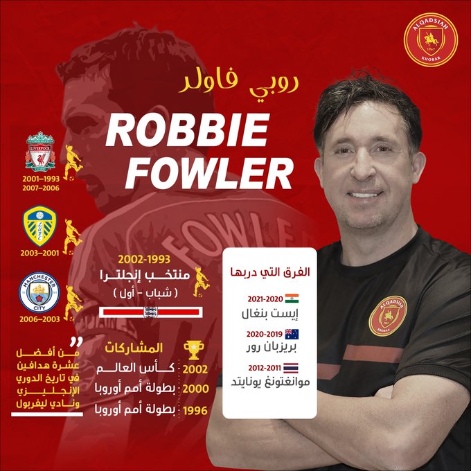 أعلنت إدارة نادي القادسية السعودي، وبشكل رسمي، اليوم الخميس، التوقيع مع المدرب الإنجليزي روبي فاولر أسطورة نادي ليفربول، للعمل كمدرب للفريق الأول الذي ينافس في دوري الدرجة الأولى السعودي.
