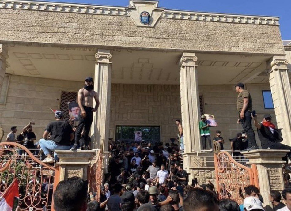 لحظة اقتحام المتظاهرين لمقر السفارة السويدية في العراق (فيديو وصور)