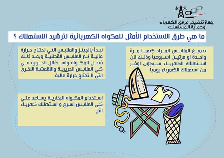 حددت الصفحة الرسمية لجهاز مرفق الكهرباء وحماية المستهلك طرق الاستخدام الأمثل للمكواة الكهربائية لترشيد الاستهلاك.