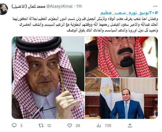 وأشاد متابعون بمواقف الملك عبدالله بن عبد العزيز ووزير الخارجية الأمير سعود الفيصل، ووقوفهما ضد الدول الربية الداعمة للفوضى في مصر، وكتب مغرد:" وعشان احنا شعب يعرف معنى الوفاء ولاينكر الجميل فلم ولن ننسى الدور البطولى العظيم لجلالة المغفورلهما الملك عبدالله والامير سعود الفيصل رحمهما الله ووقفتهم البطولية مع الزعيم السيسى والشعب المصرى وتحييد كل دول اوروبا والدعم السياسىى والمادى الذى يفوق الوصف".