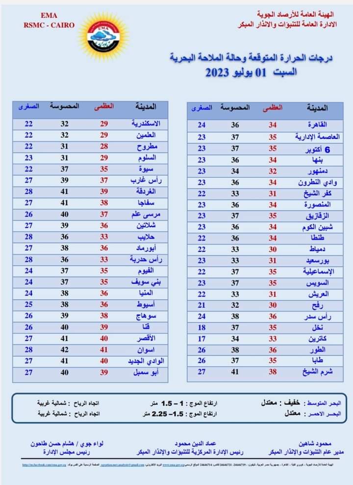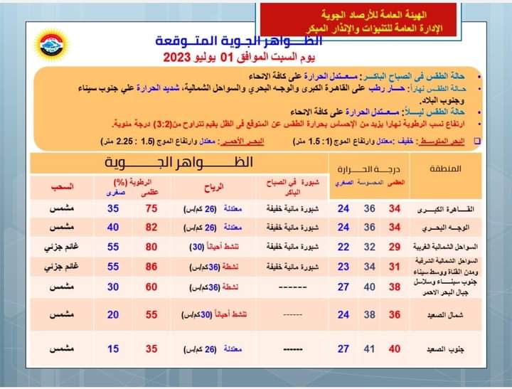 وأعلنت هيئة الأرصاد الجوية، حالة الطقس، غدًا السبت، بالتزامن مع رابع أيام عيد الأضحى المبارك حيث يسود طقس معتدل صباحا، حار نهارا، مائل للحرارة على السواحل الشمالية، شديد الحرارة على جنوب الصعيد.
