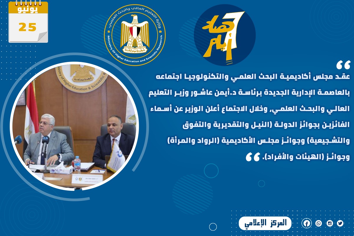 3) عقد مجلس أكاديمية البحث العلمي والتكنولوجيا فى اجتماعه بالعاصمة الإدارية الجديدة برئاسة د.أيمن عاشور وزير التعليم العالي والبحث العلمي، وخلال الاجتماع أعلن الوزير عن أسماء الفائزين بجوائز الدولة (النيل والتقديرية والتفوق والتشجيعية) وجوائز مجلس الأكاديمية (الرواد والمرأة) وجوائز (الهيئات والأفراد).