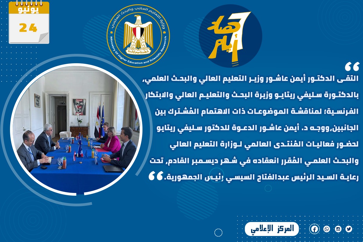 2) التقى الدكتور أيمن عاشور وزير التعليم العالي والبحث العلمي، بالدكتورة سليفي ريتايو وزيرة البحث والتعليم العالي والابتكار الفرنسية؛ لمناقشة الموضوعات ذات الاهتمام المُشترك بين الجانبين،ووجه د. أيمن عاشور الدعوة للدكتور سليفي ريتايو لحضور فعاليات المُنتدى العالمي لوزارة التعليم العالي والبحث العلمي المُقرر انعقاده في شهر ديسمبر القادم، تحت رعاية الرئيس عبدالفتاح السيسي رئيس الجمهورية.