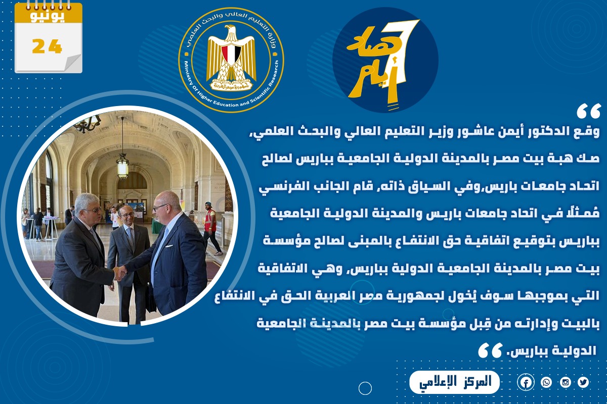 1) وقع الدكتور أيمن عاشور وزير التعليم العالي والبحث العلمي، صك هبة بيت مصر بالمدينة الدولية الجامعية بباريس لصالح اتحاد جامعات باريس،وفي السياق ذاته، قام الجانب الفرنسي مُمثلًا في اتحاد جامعات باريس والمدينة الدولية الجامعية بباريس بتوقيع اتفاقية حق الانتفاع بالمبنى لصالح مؤسسة بيت مصر بالمدينة الجامعية الدولية بباريس، وهي الاتفاقية التي بموجبها سوف يُخول لجمهورية مصر العربية الحق في الانتفاع بالبيت وإدارته من قِبل مؤسسة بيت مصر بالمدينة الجامعية الدولية بباريس.