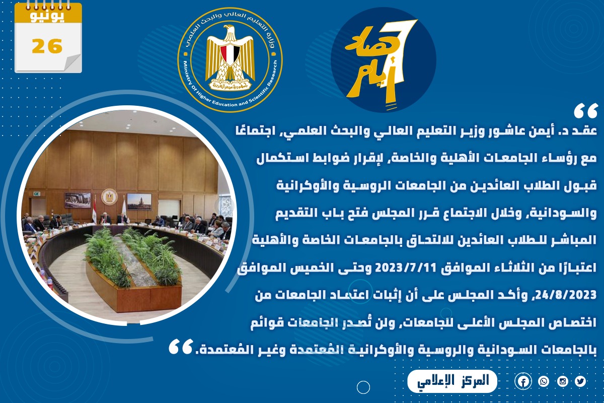 4) عقد د. أيمن عاشور وزير التعليم العالي والبحث العلمي، اجتماعًا مع رؤساء الجامعات الأهلية والخاصة، لإقرار ضوابط استكمال قبول الطلاب العائدين من الجامعات الروسية والأوكرانية والسودانية، وخلال الاجتماع قرر المجلس فتح باب التقديم المباشر للطلاب العائدين للالتحاق بالجامعات الخاصة والأهلية اعتبارًا من الثلاثاء الموافق 11/7/2023 وحتى الخميس الموافق 24/8/2023، وأكد المجلس على أن إثبات اعتماد الجامعات من اختصاص المجلس الأعلى للجامعات، ولن تُصدر الجامعات قوائم بالجامعات السودانية والروسية والأوكرانية المُعتمدة وغير المُعتمدة.