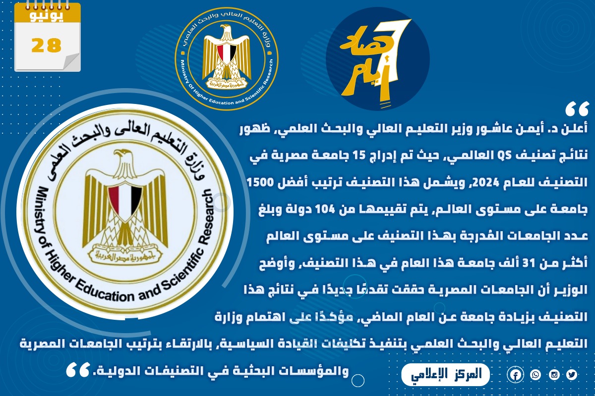 6) أعلن د. أيمن عاشور وزير التعليم العالي والبحث العلمي، ظهور نتائج تصنيف QS العالمي، حيث تم إدراج 15 جامعة مصرية في التصنيف للعام 2024، ويشمل هذا التصنيف ترتيب أفضل 1500 جامعة على مستوى العالم، يتم تقييمها من 104 دولة وبلغ عدد الجامعات المُدرجة بهذا التصنيف على مستوى العالم أكثر من 31 ألف جامعة هذا العام في هذا التصنيف، وأوضح الوزير أن الجامعات المصرية حققت تقدمًا جديدًا في نتائج هذا التصنيف بزيادة جامعة عن العام الماضي، مؤكدًا على اهتمام وزارة التعليم العالي والبحث العلمي بتنفيذ تكليفات القيادة السياسية، بالارتقاء بترتيب الجامعات المصرية والمؤسسات البحثية في التصنيفات الدولية.