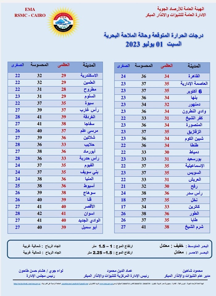 ونشرت هيئة الأرصاد الجوية بيانا بدرجات الحراة المتوقعة اليوم السبت والتي جاءت كالتالي: