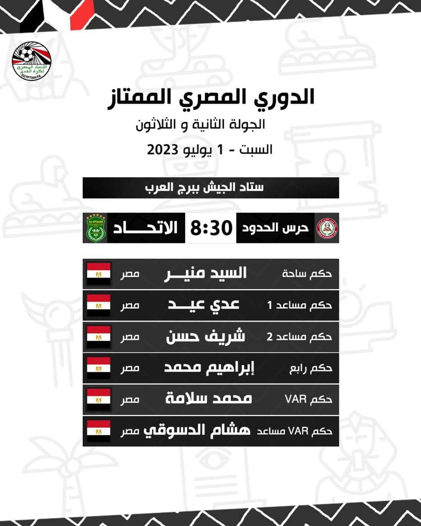 ومن المقرر أن يدير لقاء حرس الحدود والاتحاد السكندري الحكم السيد منير، ويعاونه عدي عيد وشريف حسن وإبراهيم محمد، ومحمد سلامة حكما لتقينة الفيديو ويعاونه هشام الدسوقي.