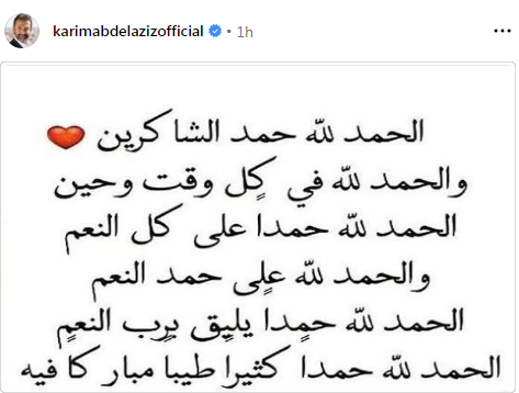 وكتب كريم عبد العزيز قائلا: “الحمد لله حمد الشاكرين والحمد الله في كل وقت وحين.. والحمد لله حمدا على كل النعم والحمد الله على حمد النعم.. والحمد لله حمدا يليق برب النعم.. والحمدلله حمدا كثيرا طيبا مباركا فيه”.