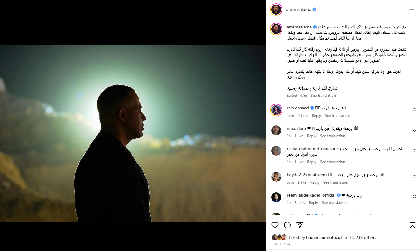 واختتم عمرو سلامة قائلا: "الموت حق، ولا يدري إنسان كيف أو متى يموت، ولكنه لا ينتهي طالما يتذكره الناس ويفكرون فيه.. التعازي لكل أقاربه وأصدقائه ومحبيه".
