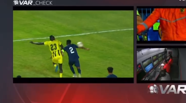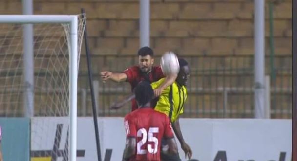 وتظهر في إعادة الكرة وجود مخالفة ولمس الكرة لمدافع الداخلية في كرة مشتركة مع مهاجم المقاولون في منطقة الجزاء.
