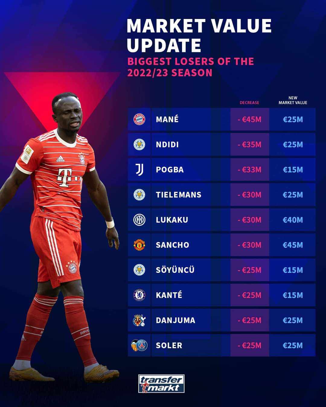 - ساديو ماني لاعب بايرن ميونخ كانت قيمته 70 مليون خسر 45 مليون يورو من قيمته لتصبح القيمة الحالية له 25 مليون.