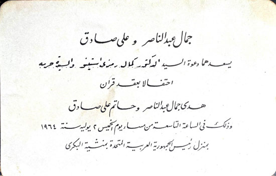 جاء نص الدعوة: جمال عبد الناصر وعلى صادق يسعدهما دعوة السيد ـــــــ والسيدة حرمه احتفالًا بعقد قران هدى جمال عبد الناصر وحاتم علي صادق وذلك في الساعة التاسعة من مساء يوم الخميس 2 يوليو سنة 1964 بمنزل رئيس الجمهورية العربية المتحدة بمنشية البكري.