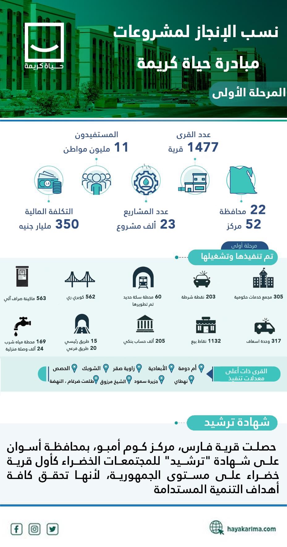 نشرت الصفحة الرسمية لمبادرة حياة كريمةإنفرجراف عبر صفحتها الرسمية على الفيس بوك يوضح الموقف التنفيذي للمرحلة الأولى من المشروع القومي لتطوير الريف المصري "حياة كريمة"