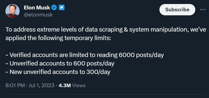 وتحدد قوانين تويتر الجديدة، التي أطلقها الملياردير الأمريكي إيلون ماسك، عدد التغريدات التي يمكن أن يستخدمها النشطاء في اليوم، ووفقًا لما جاء في تغريدته حدد أيلون ماسك القوانين الجديدة لتويتر "الحسابات الموثقة بإمكانها قراءة 6000 تغريدة يوميًا فقط. والحسابات غير الموثقة بإمكانها قراءة 600 تغريدة يوميًا فقط. والحسابات غير الموثقة والمنشأة حديثًا بإمكانها قراءة 300 تغريدة في اليوم فقط".