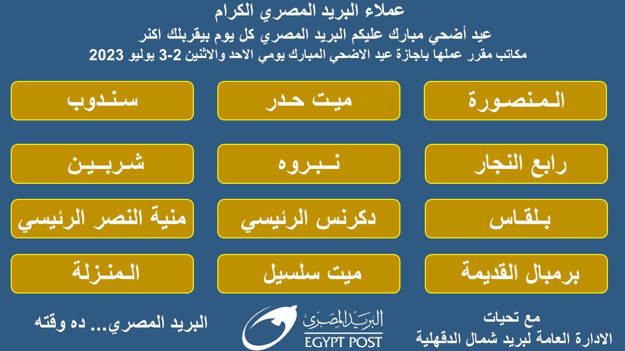 أعلن الدكتور أيمن مختار محافظ الدقهلية عن تشغيل عدد من مكاتب البريد بنطاق المحافظة خلال أجازة عيد الأضحى المبارك يومي الأحد والإثنين الموافقين 2 و3 يوليو.