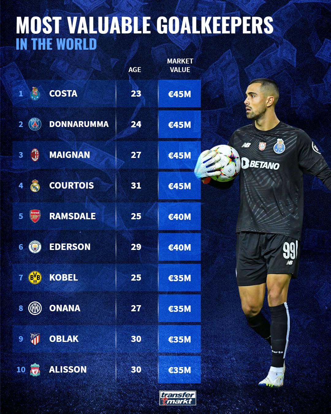 وتصدر ديوجو كوستا قائمة أغلى 10 حراس مرمى في العالم بقيمة 45 مليون يورو، بالتساوي مع دوناروما حارس باريس سان جيرمان الفرنسي، وماينان حارس إيه سي ميلان الإيطالي، وتيبو كورتوا حارس ريال مدريد، إلا أن حارس بورتو يتفوق بسبب صغر سنه حيث يبلغ من العمر 23 عاما، فيما يبلغ عمر دوناروما 24 سنة وماينان 27 سنة، وكورتوا 31 سنة.