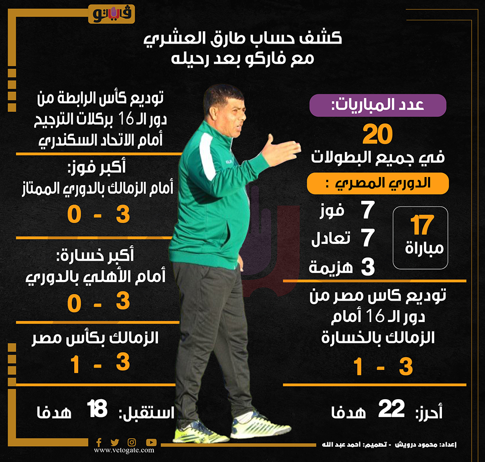 كشف حساب طارق العشري مع فاركو بعد رحيله (إنفوجراف) الإثنين 03/يوليو/2023 - 01:14 م 7/3/2023 1:14:11 PM طارق العشري، فيتو محمود درويش شارك طباعة 18 حجم الخط شارك طباعة طارق العشري فاركو نادي فاركو الدوري المصري كأس مصر