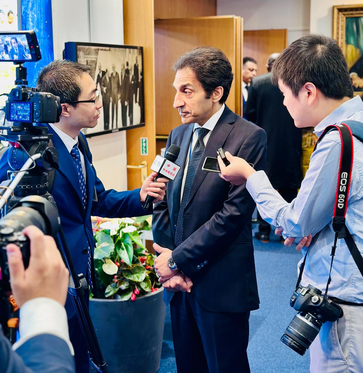 جاءت تصريحات السفير بسام راضي لوكالة الانباء الصينية الرسمية شينخوا وقناتها الصينية الفضائية عقب اعادة انتخاب الدكتور شو دونيو مباشرة، حيث تطرق كذلك بسام راضي اثناء اللقاء الى العلاقات المصرية الصينية، مشيرًا إلى تكامل المبادرة الصينية “الحزام والطريق” مع جهود مصر التنموية، خاصةً تلك المتعلقة بتنمية محور قناة السويس، وكذا تطوير البنية الأساسية بالدولة، لا سيّما في مجالات الطرق والموانئ البحرية والطاقة.