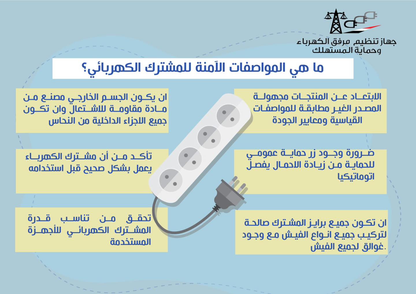 حددت الصفحة الرسمية لـ جهاز مرفق الكهرباء وحماية المستهلك للمواطنين أبرز المواصفات الآمنة للمشترك الكهربائي، وذلك تجنبًا لنشوب اشتغال به نتيجة الحمل الزائد أو عدم الكفاءة العالية.