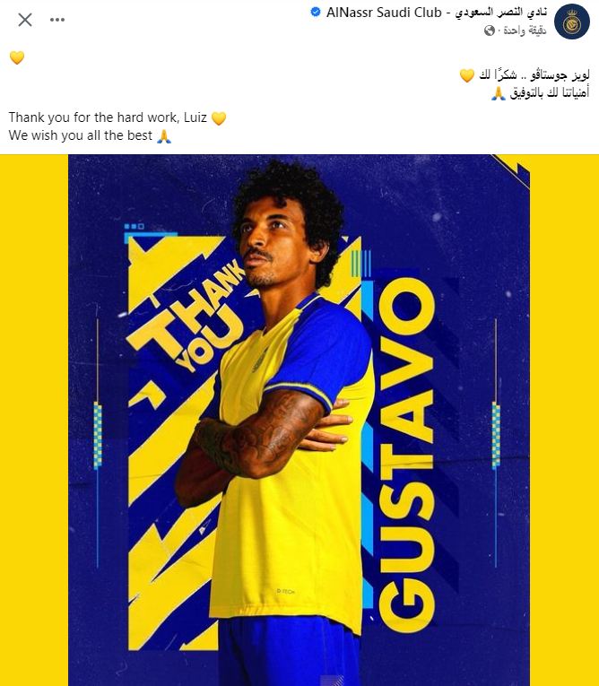 ونشرت الصفحة الرسمية لفريق النصر السعودي علي فيس بوك قائلة: شكرا لك لويز جوستافو نتمنى لك التوفيق في القادم.