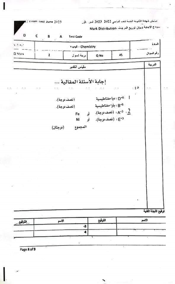 الثانوية العامة 2023، نموذج إجابة الأسئلة المقالية لامتحان الكيمياء وتوزيع الدرجات