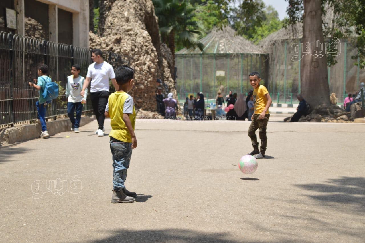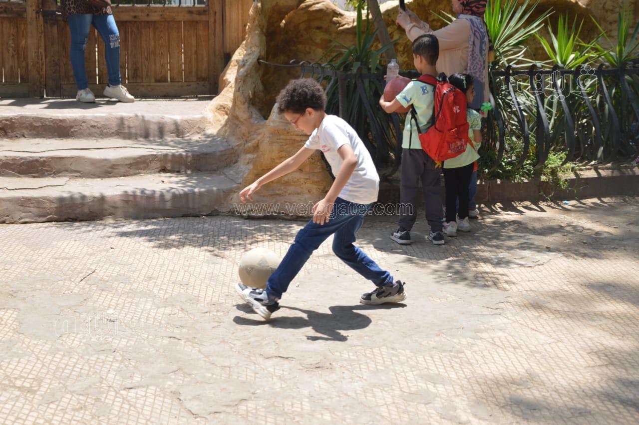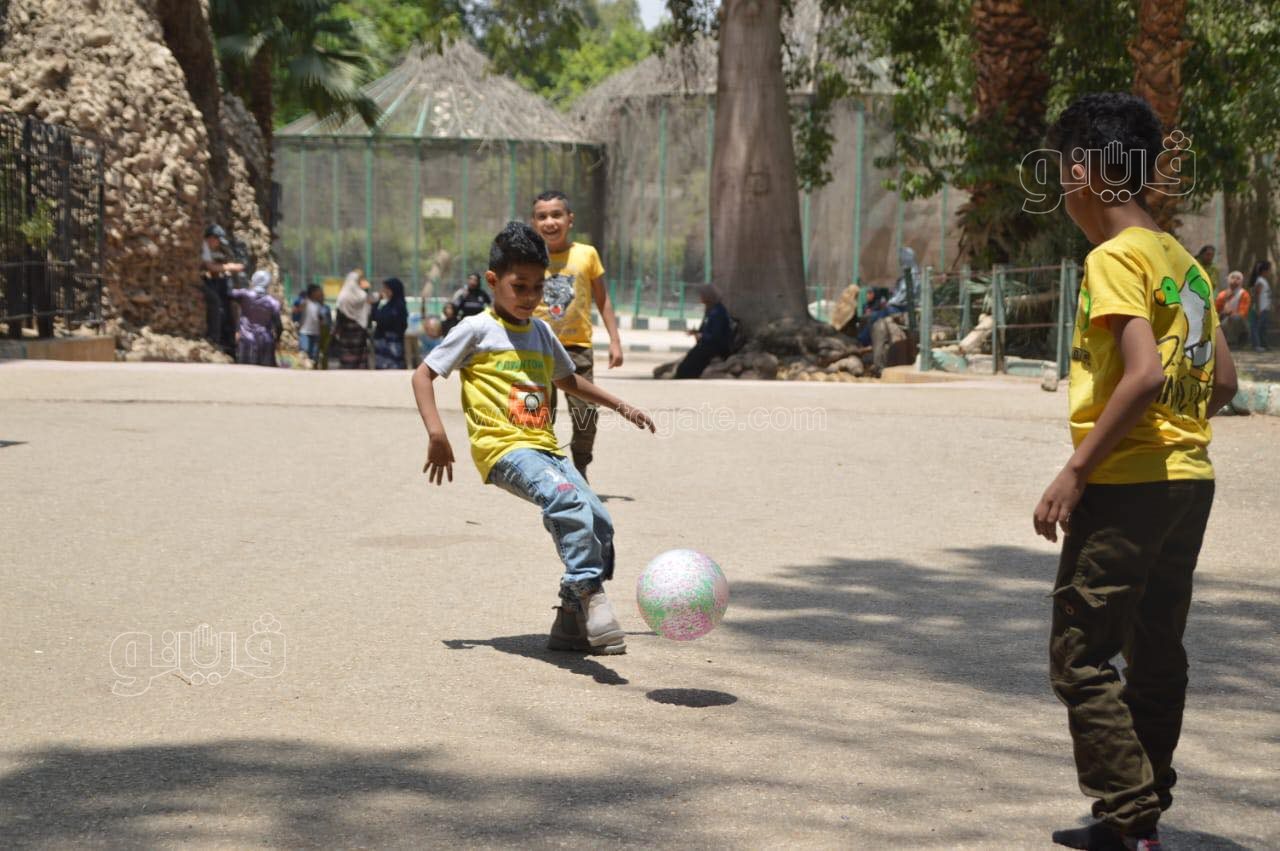تصدر اللعب بكرة القدم والسلة المشهد في حديقة الحيوان حيث استغل الأطفال المساحات الشاسعة للعب بها والاستمتاع بالإجازة قبل نهايتها.