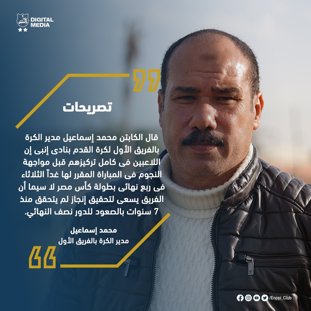 كأس مصر، قال محمد إسماعيل مدير الكرة بالفريق الأول لكرة القدم بنادى إنبى إن اللاعبين فى كامل تركيزهم قبل مواجهة فريق النجوم فى المباراة المقرر لها غدًا الثلاثاء فى ربع نهائى بطولة كأس مصر لا سيما أن الفريق يسعى لتحقيق إنجاز لم يتحقق منذ 7 سنوات بالصعود للدور نصف النهائي.