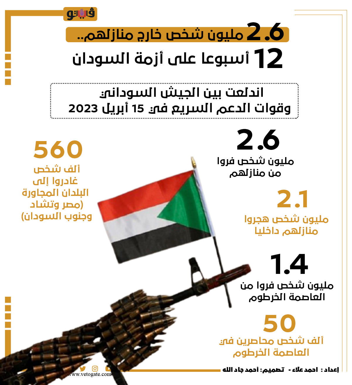 2.6 مليون شخص خارج منازلهم.. 12 أسبوعا على أزمة السودان (إنفوجراف) الثلاثاء 04/يوليو/2023 - 02:30 م 7/4/2023 2:30:13 PM اشتباكات السودان، فيتو احمد علاء شارك طباعة 18 حجم الخط شارك طباعة الجيش السوداني مليشيا الدعم السريع الخرطوم جنوب السودان اشتباكات السودان