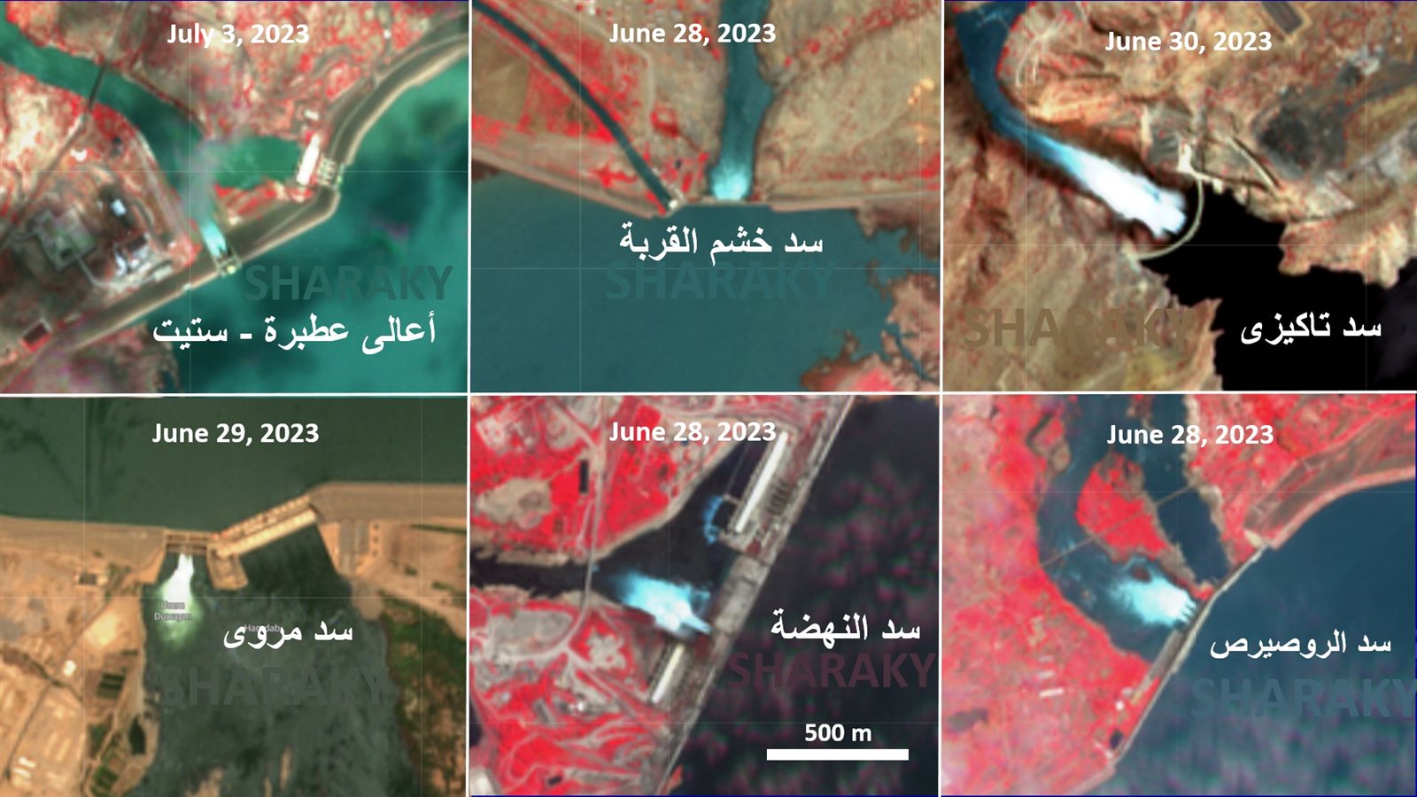 وقال: " التفريغ الكبير من سد تاكيزى يرفع منسوب المياه في نهر عطبرة ويهدد السكان مما دفع السودان إلى فتح بوابات سدي أعالي عطبرة-ستيت وخشم القربة لصغر حجم التخزين فيهما 3.5، 0.5 مليار م3، على الترتيب، وفي نفس الوقت مازالت البوابة الشرقية للتصريف في سد النهضة مفتوحة منذ 8 يناير الماضى مع زيادة المنصرف منها قليلا الأسبوع الماضى بمعدل حوالى 30 مليون م3/يوم، ومن ثم التفريغ من السدود السودانية الروصيرص وسنار ومروى".