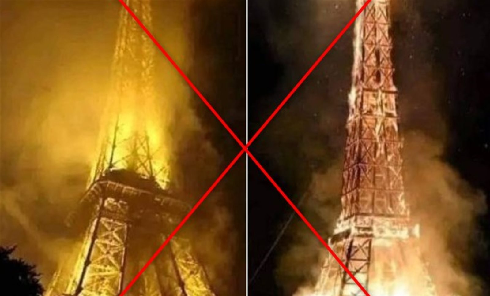 إلا أن الصورة الأولى تعود لمجسم خشبي للبرج أُحرق الشهر الماضي خلال احتفالات ناد فرنسي لكرة القدم، أما الثانية فتعود لأدخنة مفرقعات نارية في برج إيفل سنة 2005 خلال الاحتفال باليوم الوطني الفرنسي.