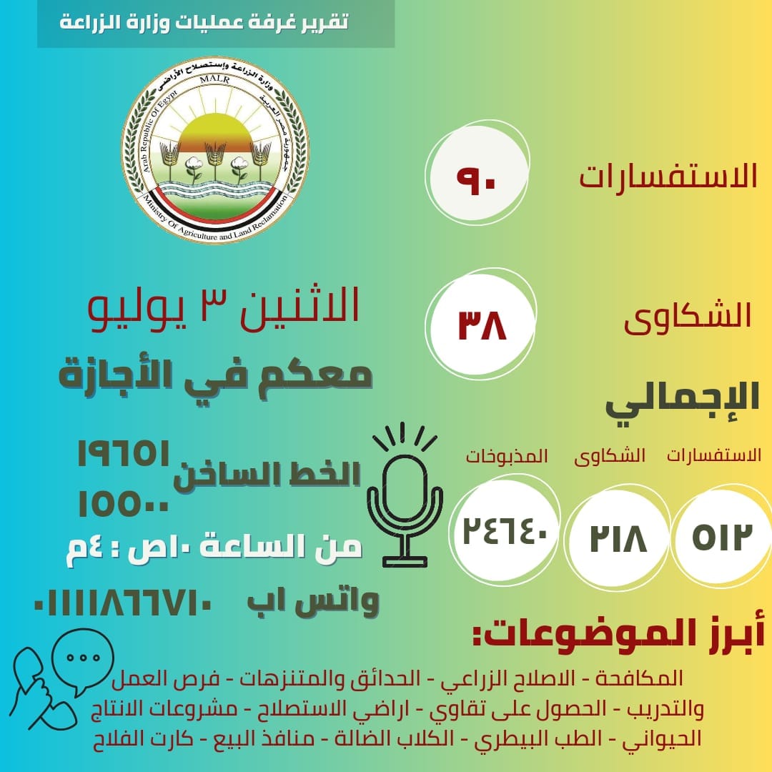 وكانت وزارة الزراعة واستصلاح الأراضي، قد اعلنت استقبال شكاوى واستفسارات المواطنين، خلال فترة الاجازة، على ارقام الخط الساخن: ١٥٥٠٠، و١٩٥٦١، من الساعه ١٠ صباحا وحتى ٤ مساءا، فضلا عن استقبال الشكاوى والاستفسارات من خلال رقم واتس اب ٠١١١١٨٦٦٧١٠.