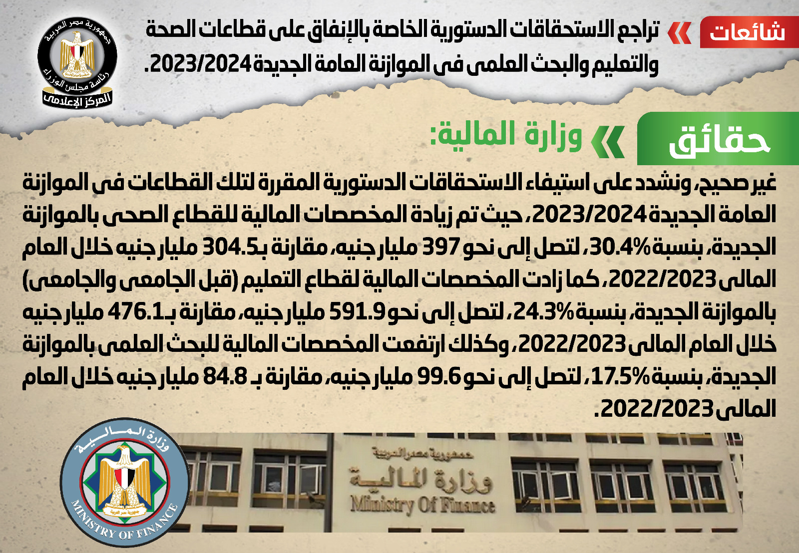 رصد المركز الإعلامي بمجلس الوزراء تداول أنباء بشأن تراجع الاستحقاقات الدستورية الخاصة بالإنفاق على قطاعات الصحة والتعليم والبحث العلمي في الموازنة العامة الجديدة 2023/2024.