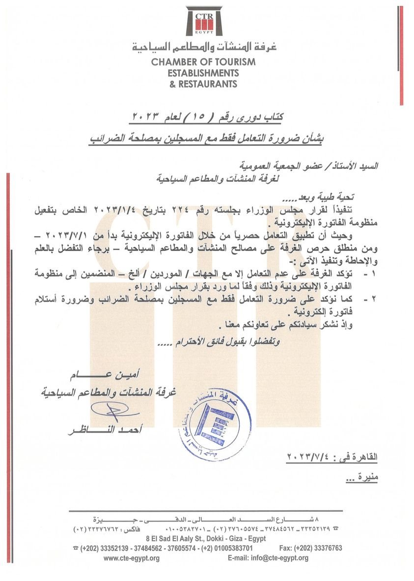 وقالت غرفة المنشأت والمطاعم السياحية في منشور دوري لها اليوم الثلاثاء تم تمعميه علي اعضائها، انه تنفيذا لقرار مجلس الوزراء بجلسته رقم 224 بتاريخ 4/1/2023 والخاص بتفعلي منظومة الفاتورة الالكترونية، وحيث ان التعامل حصريا من خلال الفاتورة الالكترونية بدءا من الاول من يوليو الجاري.