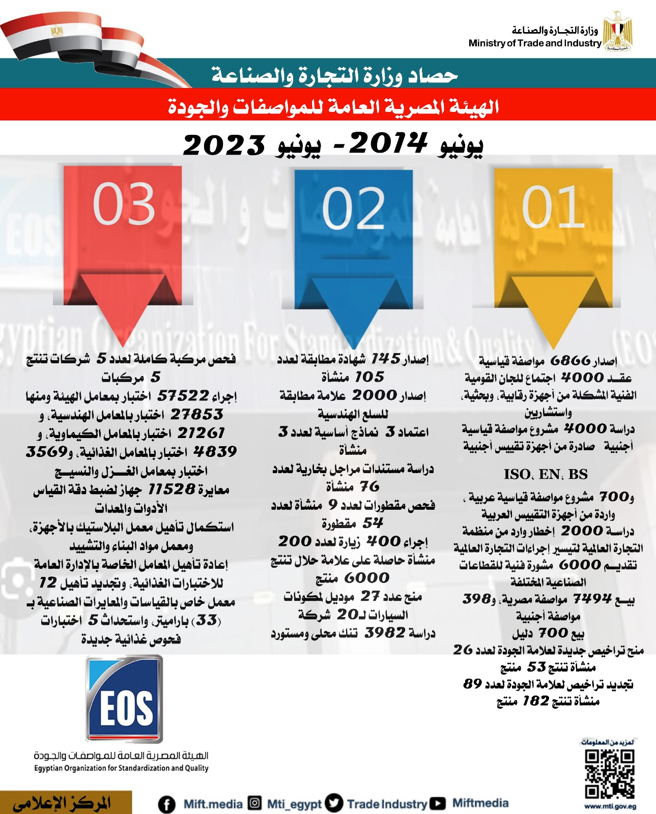 كشفت وزارة التجارة والصناعة عن قيام الهيئة المصرية العامة للمواصفات والجودة،بإصدار 6866 مواصفة قياسية، ومنح تراخيص جديدة لعلامة الجودة لعدد 26 منشأة تنتج 53 منتج، خلال الفترة من يوليو 2014 وحتى يونيو 2023.