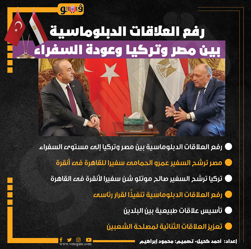 رفع العلاقات الدبلوماسية بين مصر وتركيا وعودة السفراء (إنفوجراف) الثلاثاء 04/يوليو/2023 - 06:59 م 7/4/2023 6:59:26 PM وزيرى خارجية مصر وتركيا أحمد كحيل شارك طباعة 18 حجم الخط شارك طباعة مصر وتركيا العلاقات المصرية التركية عودة السفراء بين مصر وتركيا