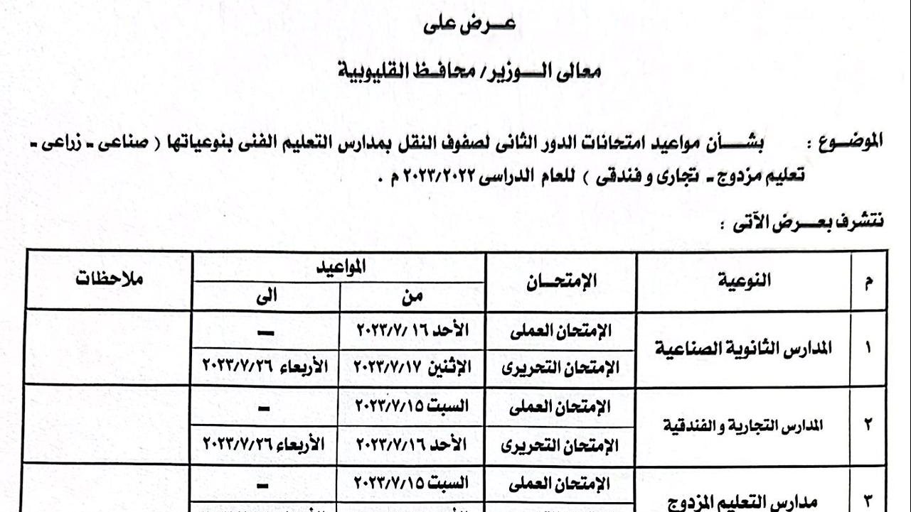 اعتمد اللواء عبد الحميد محافظ القليوبية مواعيد امتحانات الدور الثاني لصفوف النقل بمدارس التعليم الفني بنوعياتها (صناعي-زراعي-تجاري-فندقي) للعام الدراسي ٢٠٢٢/٢٠٢٣.
