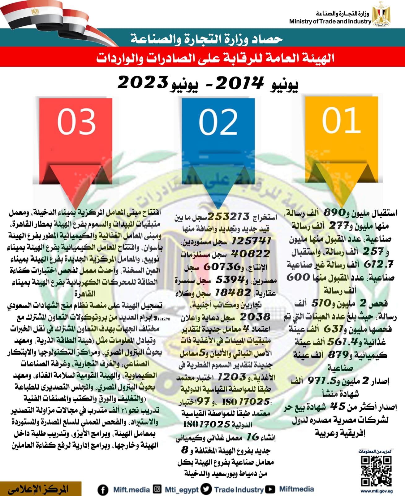 وأوضح في التقرير الصادر عن الوزارة حول إنجازات قطاع التجارة في عهد الرئيس عبد الفتاح السيسي خلال 9 سنوات، أن إنجازات الهيئة العامة للرقابة على الصادرات والواردات على مدار تلك الفترة تضمنت التالي: