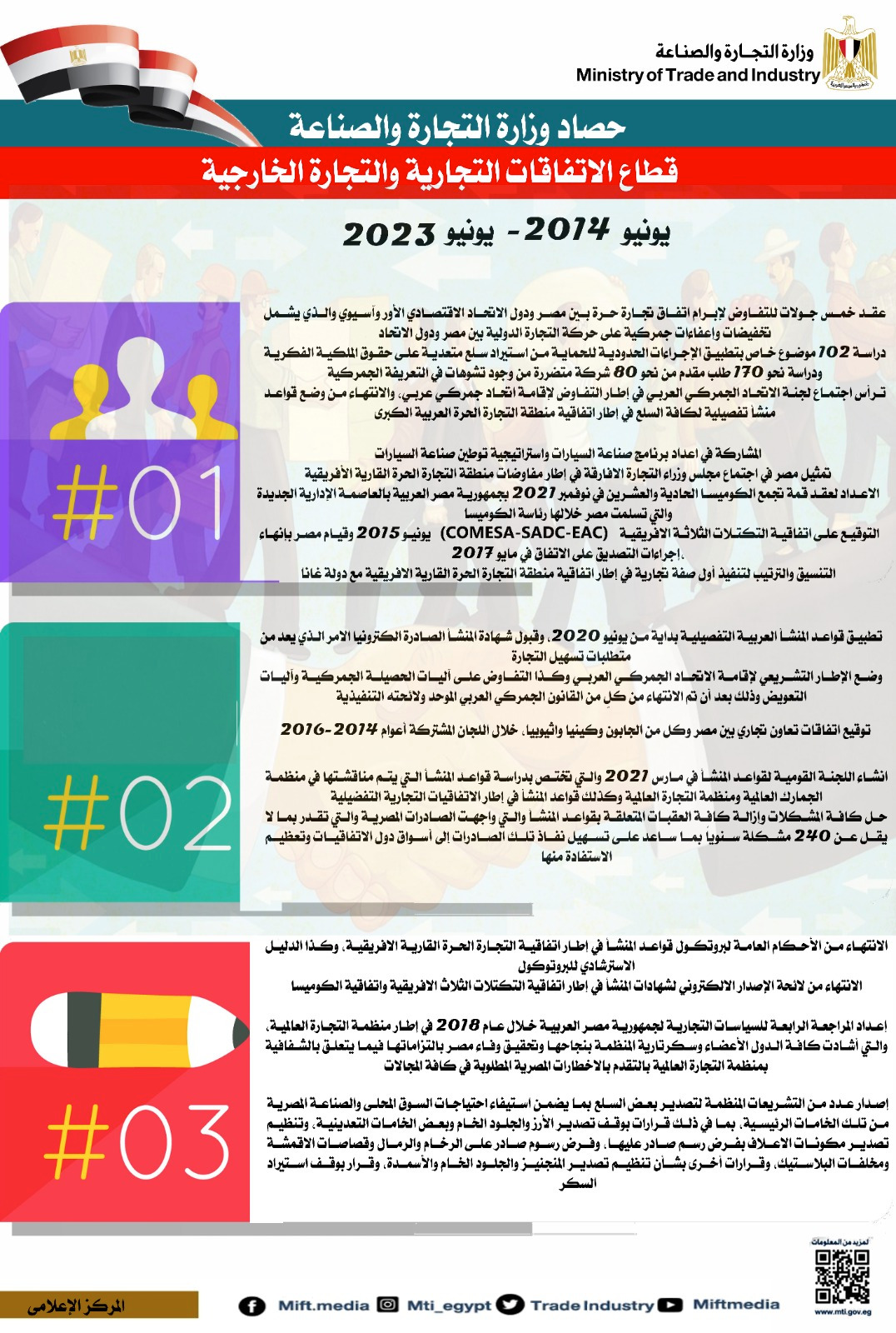 وأوضح التقرير الصادر عن الوزارة حول إنجازات قطاع التجارة في عهد الرئيس عبد الفتاح السيسي خلال 9 سنوات، أن قطاع الاتفاقات التجارية والتجارة الخارجية خلال الفترة من يونيو 2014 حتى يونيو 2023.