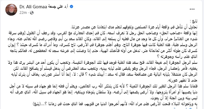 وكتب الدكتور علي جمعة تدوينة، عبر حسابه بالفيس بوم، عن صاحب الحق "نحاول أن نتأمل في واقعة أيام عزة المسلمين وتفوقهم لنعلم مدى ابتعادنا عن مصدر عزتنا. إنها واقعة «صاحب الحق» وصاحب الحق رجل لا نعرف اسمه، كان في إحدى المعارك مع الفرس، وقد عرف أن الغلول [وهي سرقة شيء من الغنائم] حرام، وأن كل ما وجد من مال فعليه أن يسلمه إلى القائد".