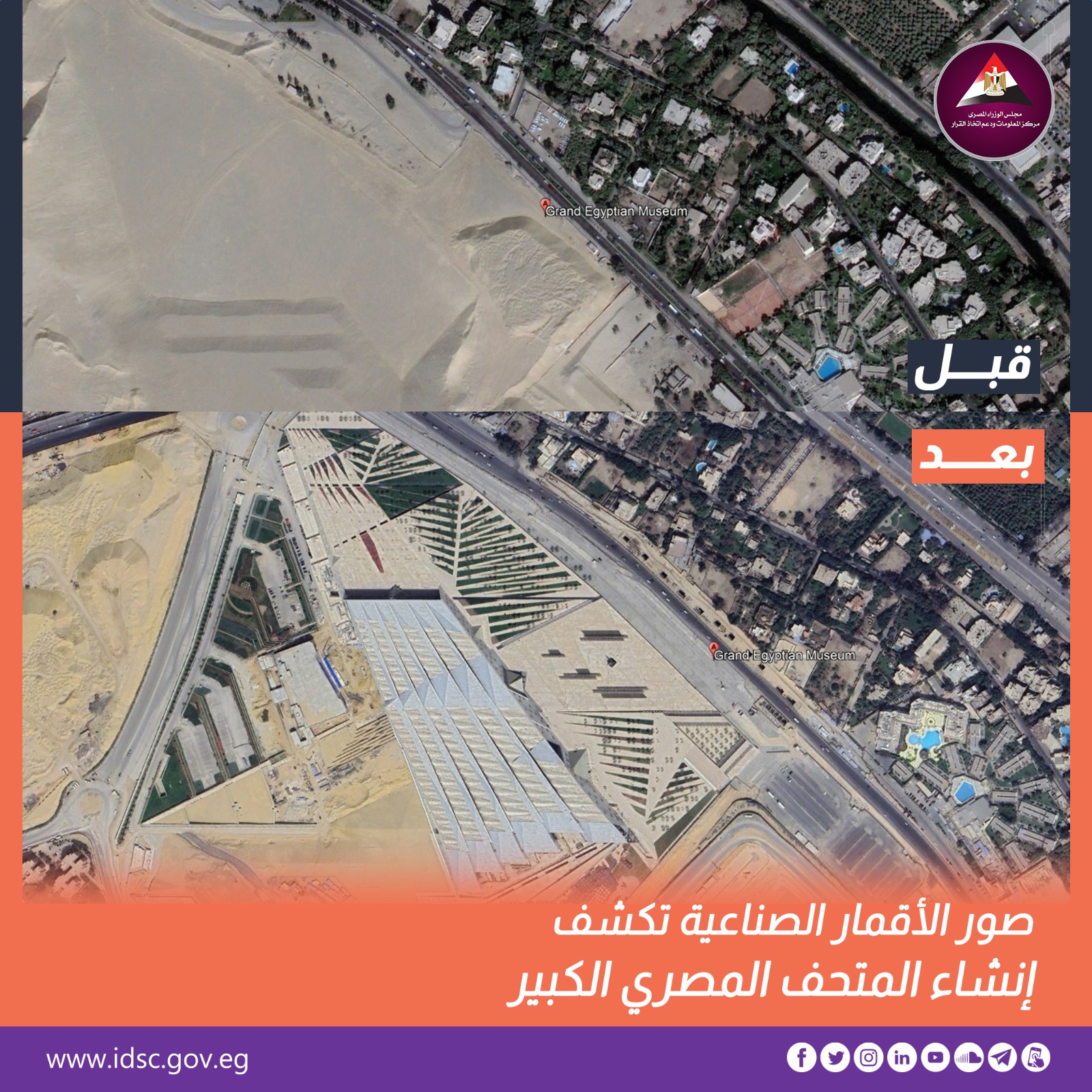 نشرت الصفحة الرسمية لمركز المعلومات ودعم اتخاذ القرار بمجلس الوزراء صور بالاقمار الصناعية، عن المتحف المصري الكبيروالذي يعد أكبر متحف في العالم للآثار.