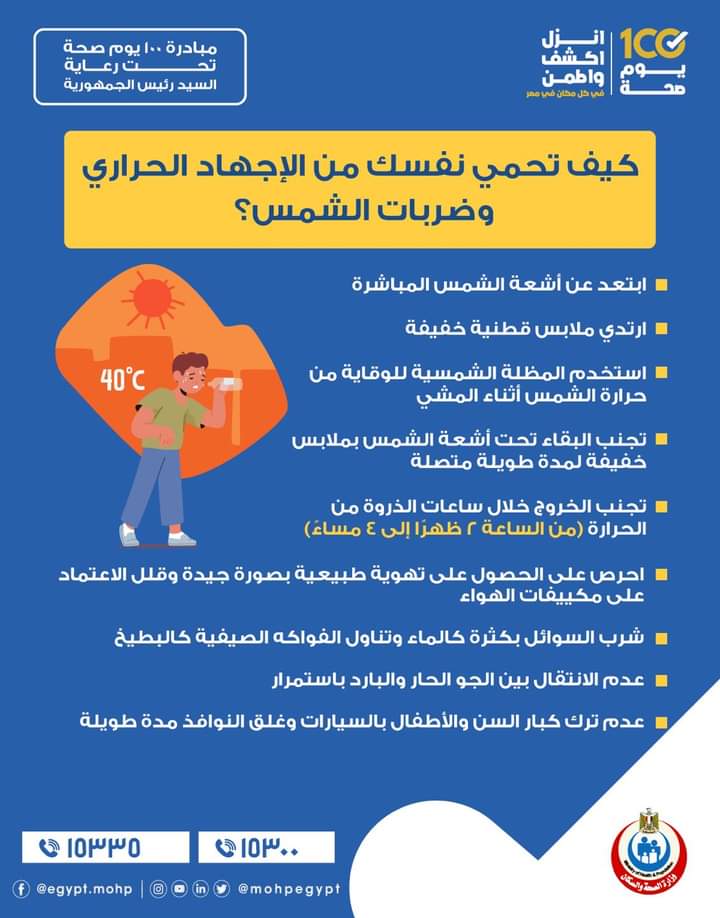 وكانت وزارة الصحة والسكان، وجهت عدة نصائح للوقاية من الإصابة بالإجهاد الحراري، تزامنا مع ارتفاع درجات حرارة الطقس في فصل الصيف.