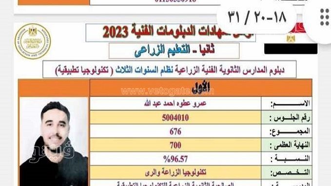 أوائل نتيجة الدبلومات الفنية 2023 ، عبر"عمرو عطوة أحمد عبدالله" الطالب بمدرسة الصالحية الثانوية الزراعية للتكنولوجيا التطبيقية محافظة الشرقية، عن سعادته بحصوله على المركز الأول ضمن أوائل الدبلومات الفنية الزراعية نظام الثلاث سنوات بمجموع 676 درجة بنسبة 96.57% قسم تكنولوجيا الزراعة والري.