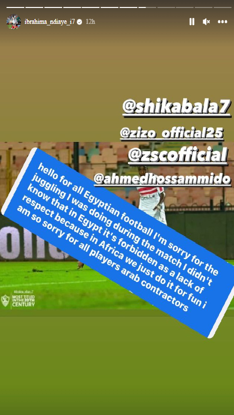 وكتب إبراهيما نداي عبر ستوري صفحته الرسمية على موقع التواصل الاجتماعي "انستجرام":"مرحبا بكل مشجعي الكرة المصرية، أنا آسف على الاستعراض الذي قمت به خلال مباراة المقاولون العرب".