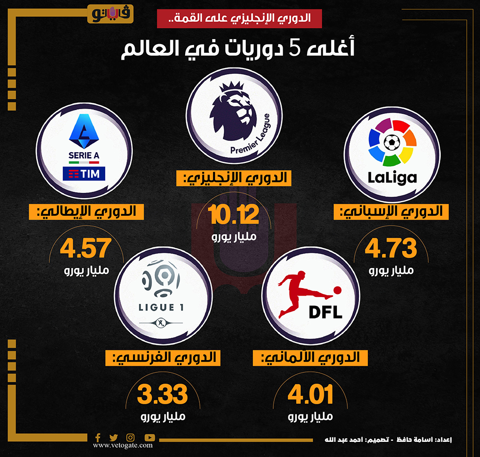 الدوري الإنجليزي على القمة.. أغلى 5 دوريات في العالم (انفو جراف) الأربعاء 05/يوليو/2023 - 06:54 م 7/5/2023 6:54:51 PM الدوري الإنجليزي اسامة حافظ شارك طباعة 18 حجم الخط شارك طباعة الدوري الألماني الدوري الإنجليز الدوري الانجليزي الدوري الإيطالي الدوري الفرنسي