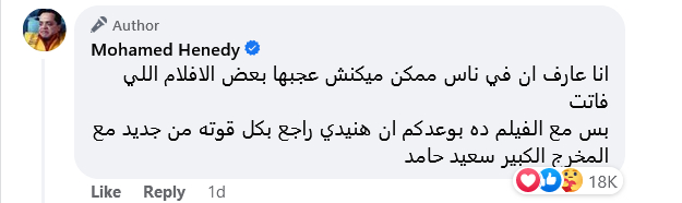 وقال هنيدي في تعليقه “أنا عارف إن في ناس ممكن ميكنش عجبها بعض الأفلام اللي فاتت.. بس مع الفيلم ده بوعدكم إن هنيدي راجع بكل قوته من جديد مع المخرج الكبير سعيد حامد”.
