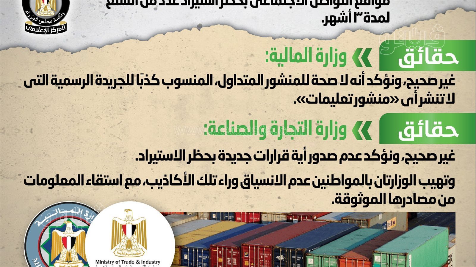 بدوره، تواصل المركز الإعلامي لمجلس الوزراء مع زارة المالية، التي نفت تلك الأنباء مُؤكدةً أنه لا صحة لمنشور التعليمات المنسوب لرئيس مصلحة الجمارك بحظر استيراد عدد من السلع لمدة ٣ أشهر، وأنه لا صحة للمنشور المتداول، المنسوب كذبًا للجريدة الرسمية التي لا تنشر أي «منشور تعليمات».