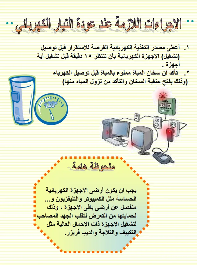 حددت الصفحة الرسمية لـ جهاز مرفق الكهرباء وحماية المستهلك للمواطنين عدة إجراءات بسيطة يجب على المواطنين القيام بها عند عودة التيار الكهربائي بعد الانقطاع لحماية الأجهزة الكهربائية من التلف بسبب فرق الجهد الكهربائي.