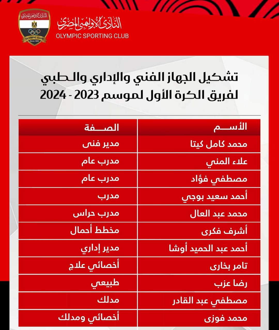 دوري القسم الثاني، اعتمد مجلس إدارة النادى الأوليمبي برئاسة الكابتن ناصر الشاذلي تشكيل الجهاز الفني والإداري والطبي لفريق الكرة الأول لكرة القدم استعدادا للمشاركة في دوري القسم الثاني “ب”.