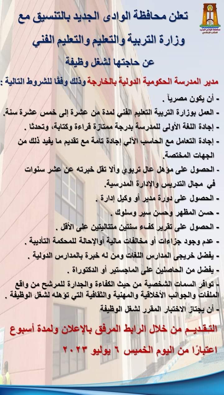 أعلنت محافظة الوادى الجديد بالتنسيق مع وزارة التربية والتعليم والتعليم الفنى عن حاجتها لشغل وظيفة مدير المدرسة الحكومية الدولية بالخارجة.